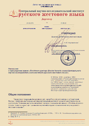 Продолжая традиции Академической науки Российской империи и Советской России, Центральный научно-исследовательский институт русского жестового языка настоящим Положением устанавливает порядок присуждения звания «Почётный доктор (Doctor honoris causa) Центрального научно-исследовательского института русского жестового языка»2.