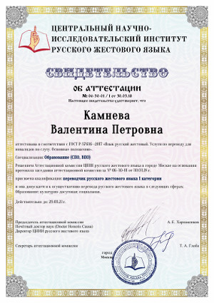 Всем переводчикам решением Аттестационной комиссии ЦНИИ русского жестового языка в городе Москве на основании протокола заседания аттестационной комиссии за № 06-30-01 от 30.03.2018 г. подтверждена квалификация "Переводчик русского жестового языка 1 категории" и они допущены к осуществлению перевода русского жестового языка в следующих сферах: образование; культурно-досуговая; социальная.