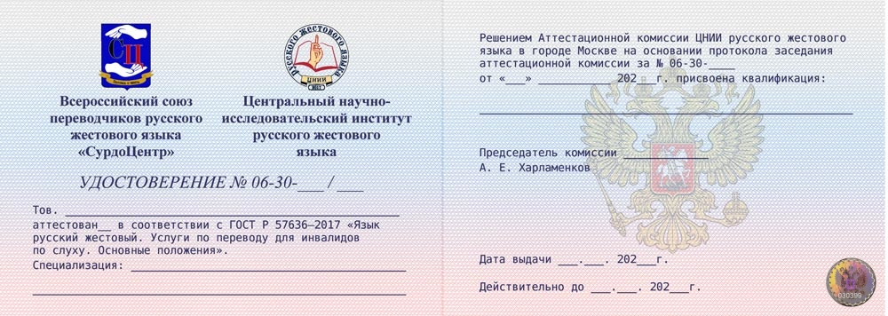 Бланк удостоверения совместный от двух организаций — Всероссийского союза переводчиков русского жестового языка «СурдоЦентр» и ЦНИИ русского жестового языка, что даёт право переводчику действовать на всей территории России. Бланк имеет высокий уровень защиты, так как печатается на бумаге с водяными знаками с вкраплением волокон, светящихся в ультрафиолете и имеет фон из гильошной сетки. Дополнительная защита — гербовая голограмма с уникальным номером. Печать и подпись, разумеется, тоже на присутствуют.