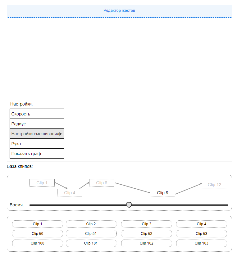 Очень важно, чтобы система была гибкой. Именно это и стало основной причиной включения пункта о разработке системы упрощённого редактирования жестов. В данной системе жест рассматривается с точки зрения его составляющих. На первом этапе выделяются следующие составляющие: