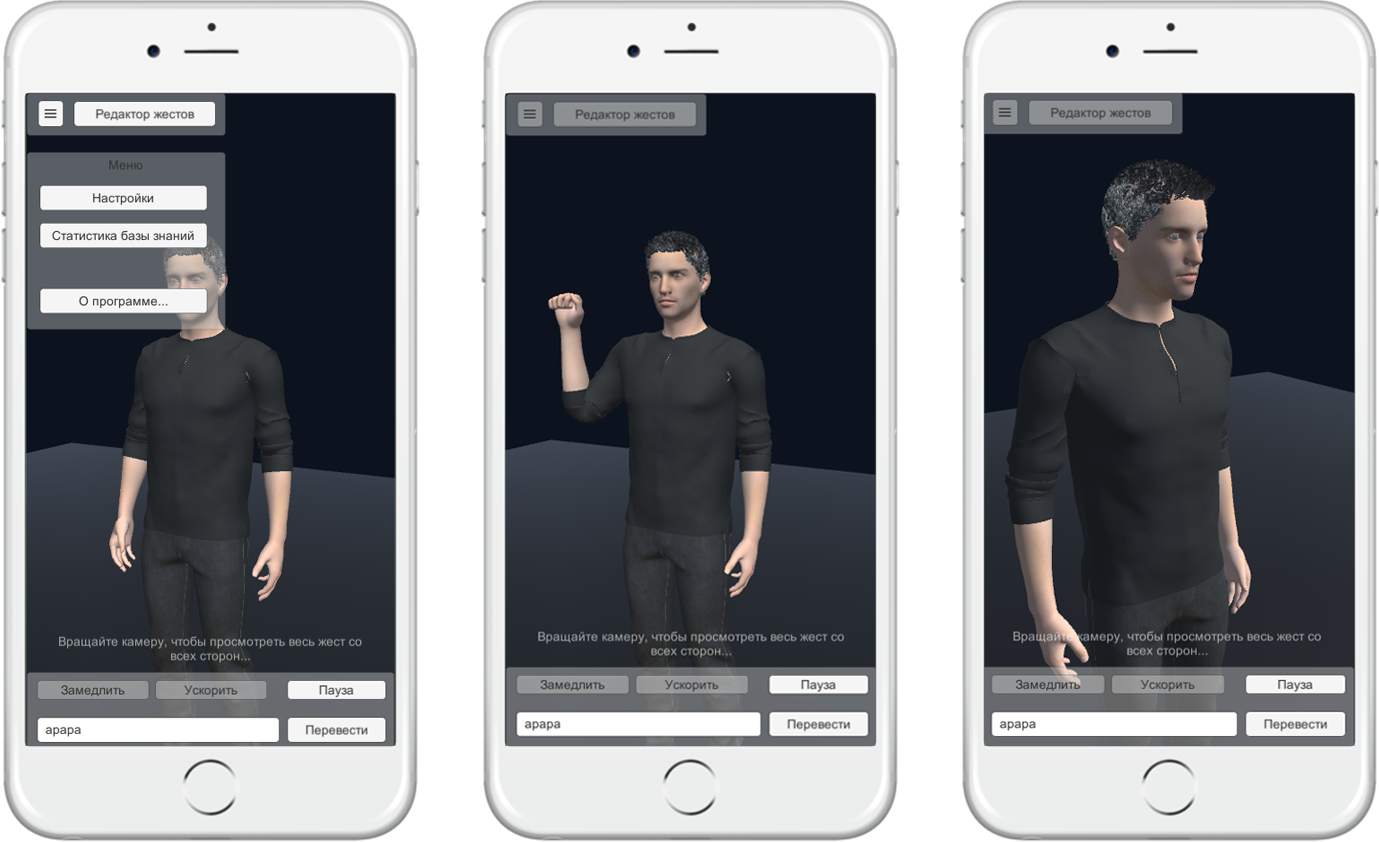 На Рис. 26 можно увидеть прототип приложения «VisualSign». Основную рабочую область занимает сама модель. Внизу имеется поле для ввода текста, а также кнопки управления воспроизведением анимации. Вверху находится меню и переход в панель редактирования жестов, прототип которой находится в разработке.