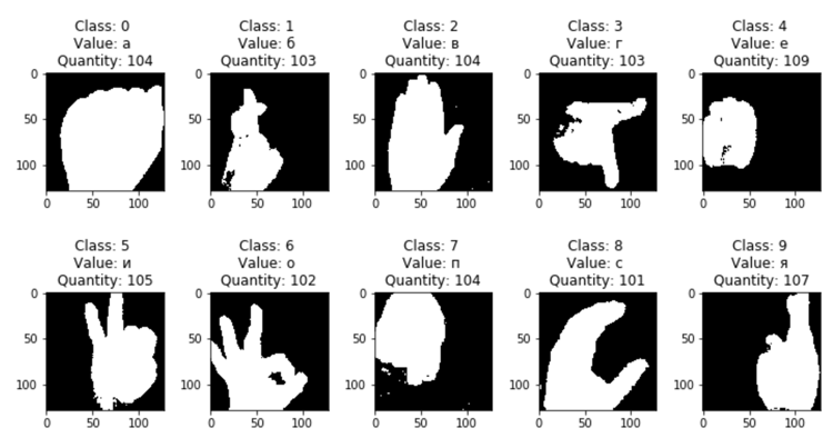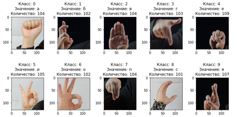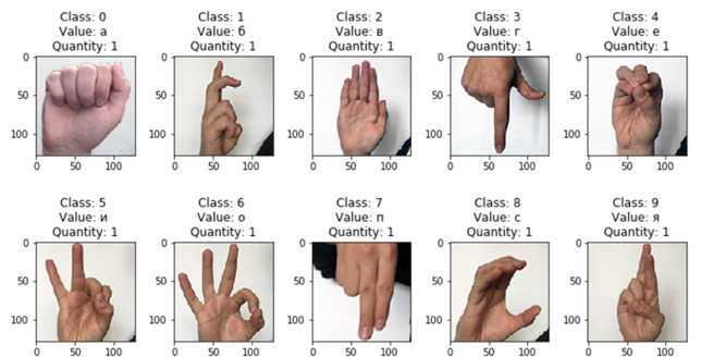Для обучения, кросс-валидации и тестирования классификатора разработан набор данных, содержащий в себе 1042 изображений кистей рук в определенной жестовой конфигурации – классе. Всего в наборе данных представлено 10 классов, каждый из которых соответствует определенной дактилеме РЖЯ.