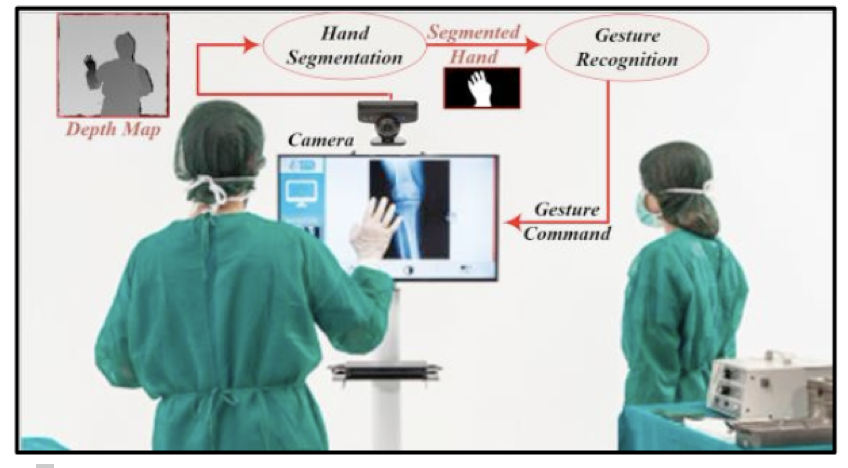 Рисунок 1: Глубина изображения используется для распознавания жестов руки хирурга. Фоновое изображение из [6].