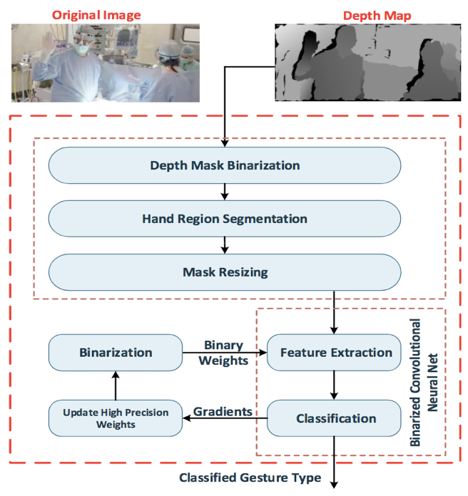 В этой статье мы предлагаем метод, основанный на глубоких нейронных сетях для решения проблемы распознавания жестов рук для приложений в хирургических кабинетах. На первом этапе нашей предлагаемой системы область руки детектируется и сегментируется как двоичная маска. Сегментация выполняется на основе информации о глубине, предоставляемой камерой. Бинарная карта, показывающая структуру руки, применяется к CNN. Для повышения эффективности CNN используется метод расширения доступных данных. CNN классифицирует изображения жестов в 10 определенных классов. Кроме того, применяется метод бинаризации сети. Бинаризация упрощает сеть для ее использования как компонента встроенной аппаратной системы. Экспериментальные результаты показывают, что наша предлагаемая система превосходит существующие сопоставимые методы с точки зрения точности распознавания и простоты реализации.