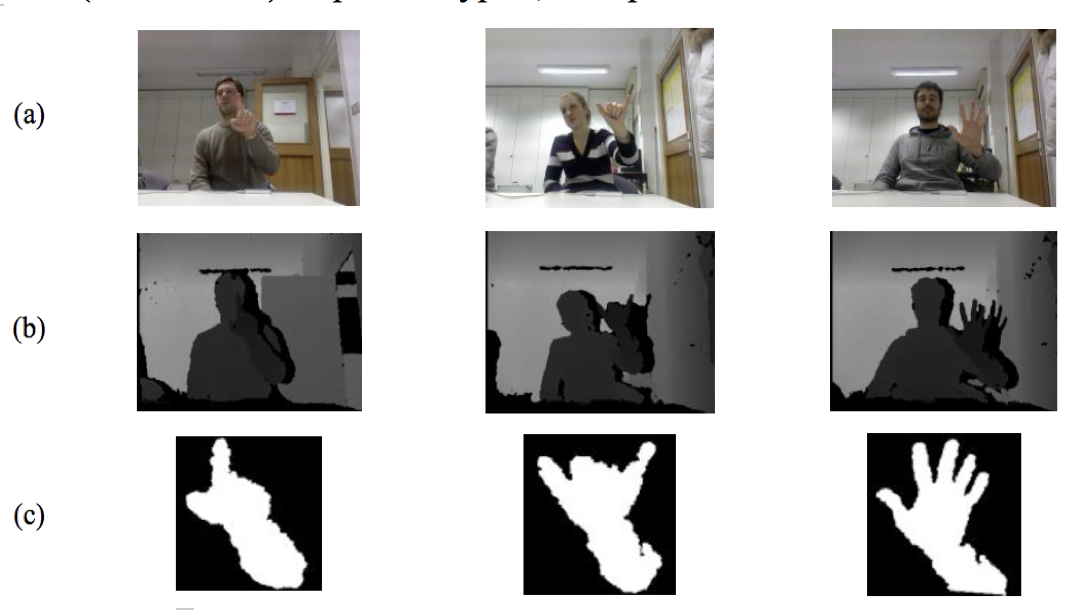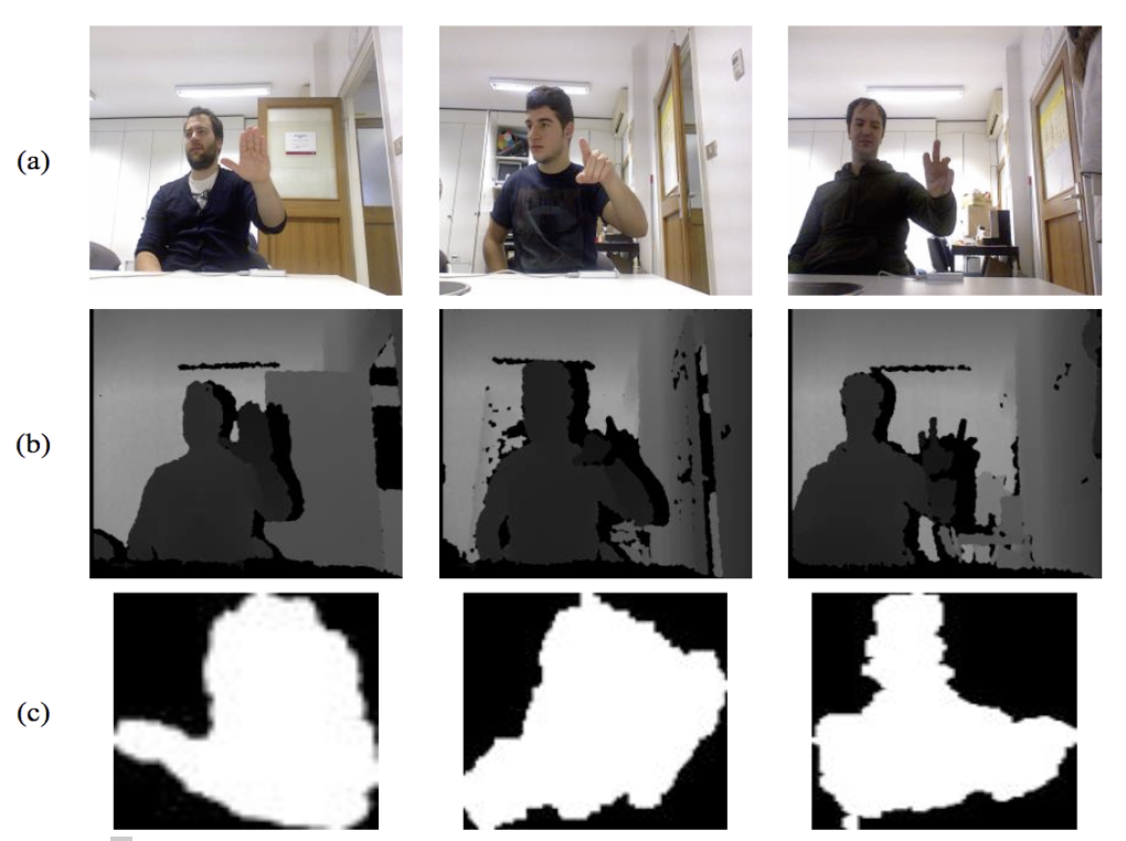 Рисунок 3: Сегментация области руки для некоторых образцов изображений из набора данных. (a) изображение RGB, (b) карта глубины и (c) сегментированная область.