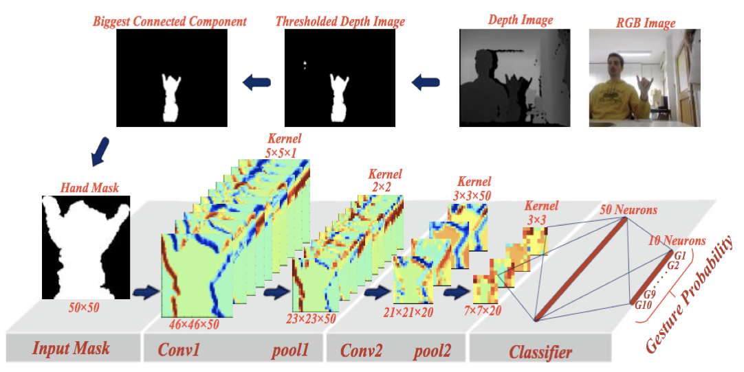 Для распределения жестов на 10 классов используется двоичная маска, созданная на предыдущем этапе. Она подается на вход CNN, архитектура которой изображена на рисунке 4. Чтобы отправить изображение в нейронную сеть, сначала изображение должно быть изменено до размера 50 × 50 пикселей. Сеть состоит из слоев свертки (Conv1 и Conv2) и слоев максимального пула (Pool1 и Pool2). Порядок слоев в сети выглядит следующим образом: Conv1, Pool1, Conv2, Pool2.