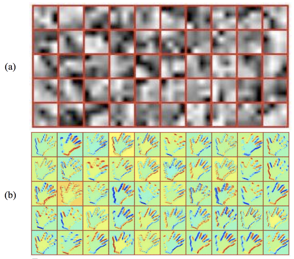 Чтобы оценить процедуру обучения CNN, обученные ядра вместе с некоторыми образцовыми картами характеристик первого сверточного слоя представлены на рисунке 5. Сеть сходится, чтобы изучить некоторые функции из ориентированных на жесты входных масок руки. Например, можно видеть, что границы рук в разных направлениях выделены на картах функций. Из обученных ядер также можно сделать вывод, что сеть узнала некоторые функции, связанные с краями руки и пальцев. Следовательно, можно сказать, что CNN будет классифицировать изображения на основе структуры руки вдоль пальцев, извлеченных путем определения их границ.