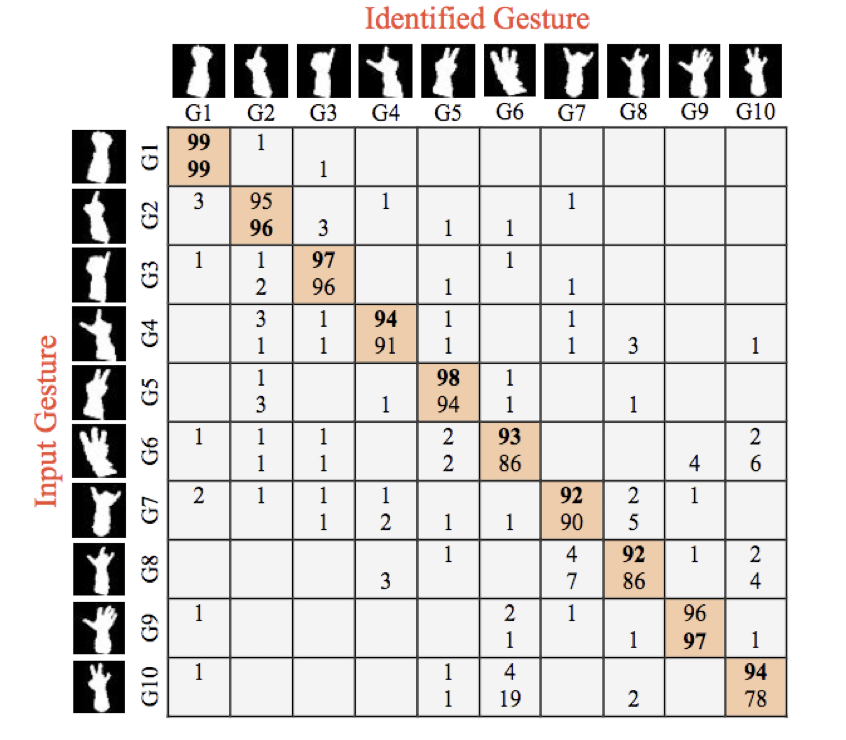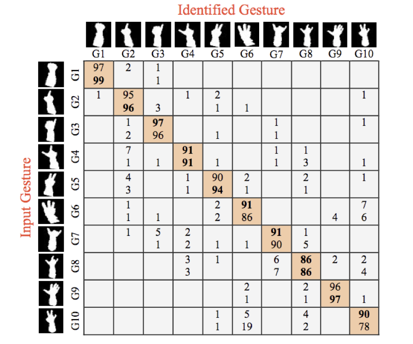Рисунок 7: Количественное сравнение результатов распознавания жестов руки для 10 разных жестов. Верхние числа взяты из бинаризованной реализации нашего метода, а нижние числа — из [11].