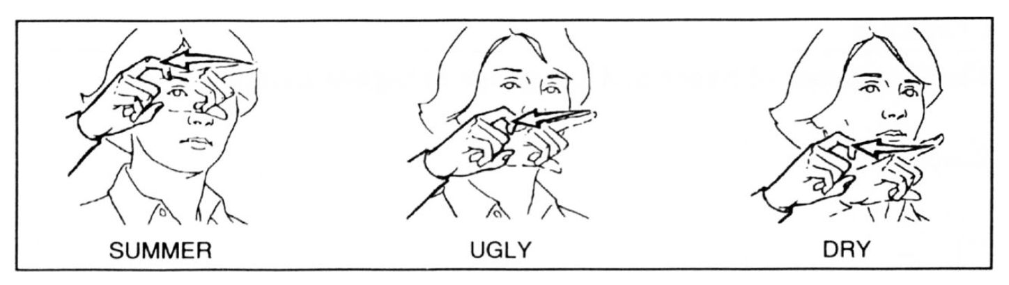 Рис. 1: Жестовое положение. На этом рисунке конфигурация и движение одинаковы; однако для каждого слова местоположение отличается. Три знака: «лето», «уродливый» и «сухой» выполняются с использованием одного и того же действия. Разные места относительно тела передают разные значения.