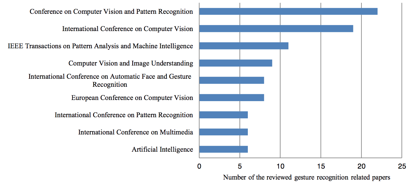 В последнее время концепция взаимодействия между людьми и роботами вызвала множество научных интересов. Вместо того, чтобы роботы заменили рабочих-людей на рабочих местах, сотрудничество человека с роботами - это направление, позволяющее сохранить рабочие места, организовав возможность роботам и людям работать вместе. Сотрудничество между людьми и роботами может освободить людей от тяжелых задач, если будут созданы эффективные каналы связи между людьми и роботами. Хотя каналы связи между людьми и роботами по-прежнему ограничены, распознавание жестов эффективно применяется в качестве интерфейса между людьми и компьютерами в течение длительного периода времени. Помимо описания ряда важных технологий и алгоритмов распознавания жестов, в этой статье представлен обзор исследований распознавания жестов и изучения возможности применения распознавания жестов во взаимодействии человека и робота. В этой статье также предлагается общая модель распознавания жестов для взаимодействия человека и робота. В модели распознавания жестов для взаимодействия человека и робота есть четыре основных технических компонента: сенсорные технологии, идентификация жестов, отслеживание жестов и классификация жестов. Рассмотренные подходы классифицируются в соответствии с четырьмя основными техническими компонентами. Статистический анализ представлен после технического анализа. В последней части обзора намечены будущие направления исследований.