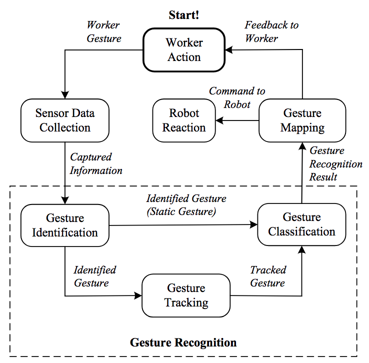 Распознавание жеста относится к математической интерпретации человеческих движений вычислительным устройством. Чтобы взаимодействовать с человеком, роботы должны правильно понимать человеческие жесты и действовать в соответствии с жестом в достаточной степени точности. В среде HRC должен быть доступен естественный способ коммуникации между роботами и людьми.