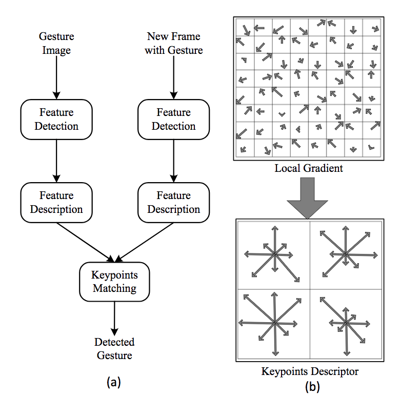 Рис. 4. SIFT: (a) алгоритм SIFT для идентификации жестов; (b) Пример дескриптора функции SIFT [41].